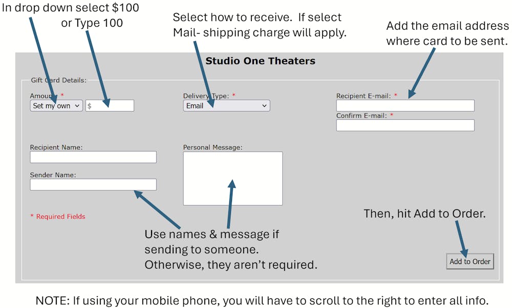 SCAM ALERT: Please note that only Gift Cards sold here at this Studio One website or sold directly from the Studio One Theaters box office are valid, authentic Studio One Theaters gift cards. Studio One Theaters does not currently sell gift cards through any other website or from any physical location other than our theater box office. If you find any other source purporting to sell Studio One Theaters gift cards (such as Groupon, Giftly or others), please know that these are NOT valid sources and you are being scammed. Studio One Theaters can only apply funds for purchases at Studio One from authentic gift cards sold directly by Studio One.