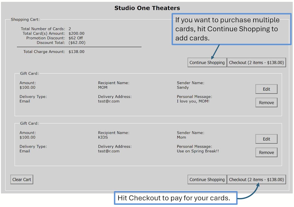 After completing payment, you will receive your gift card in the manner you selected (Email or US Mail).