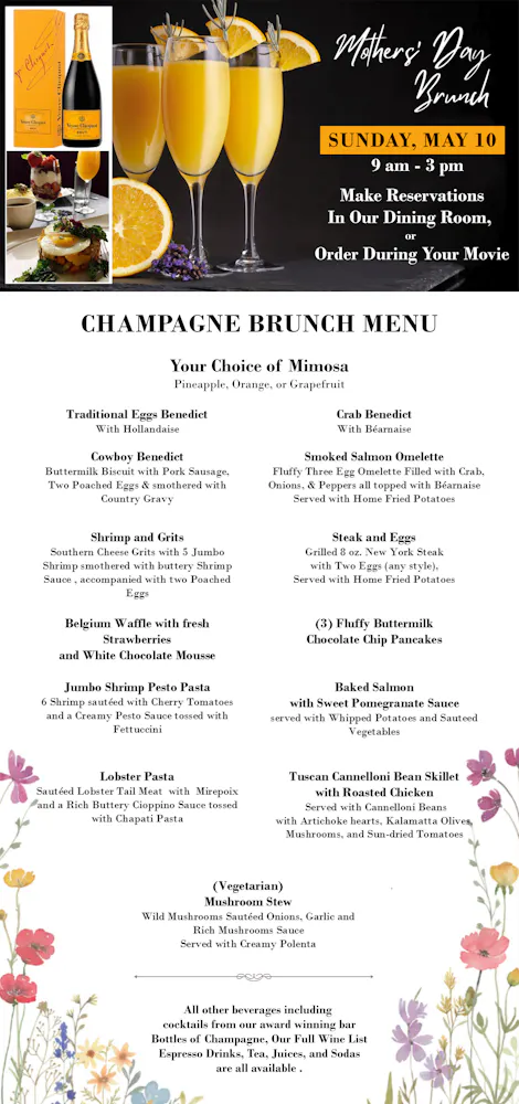 to purchase a movie ticket for your desired movie. Please remember to show up 30 mins early for your movie! You will be able to order from the Mother's Day Champagne Brunch menu as you normally would from our normal menu and your meals will be brought to your seat.