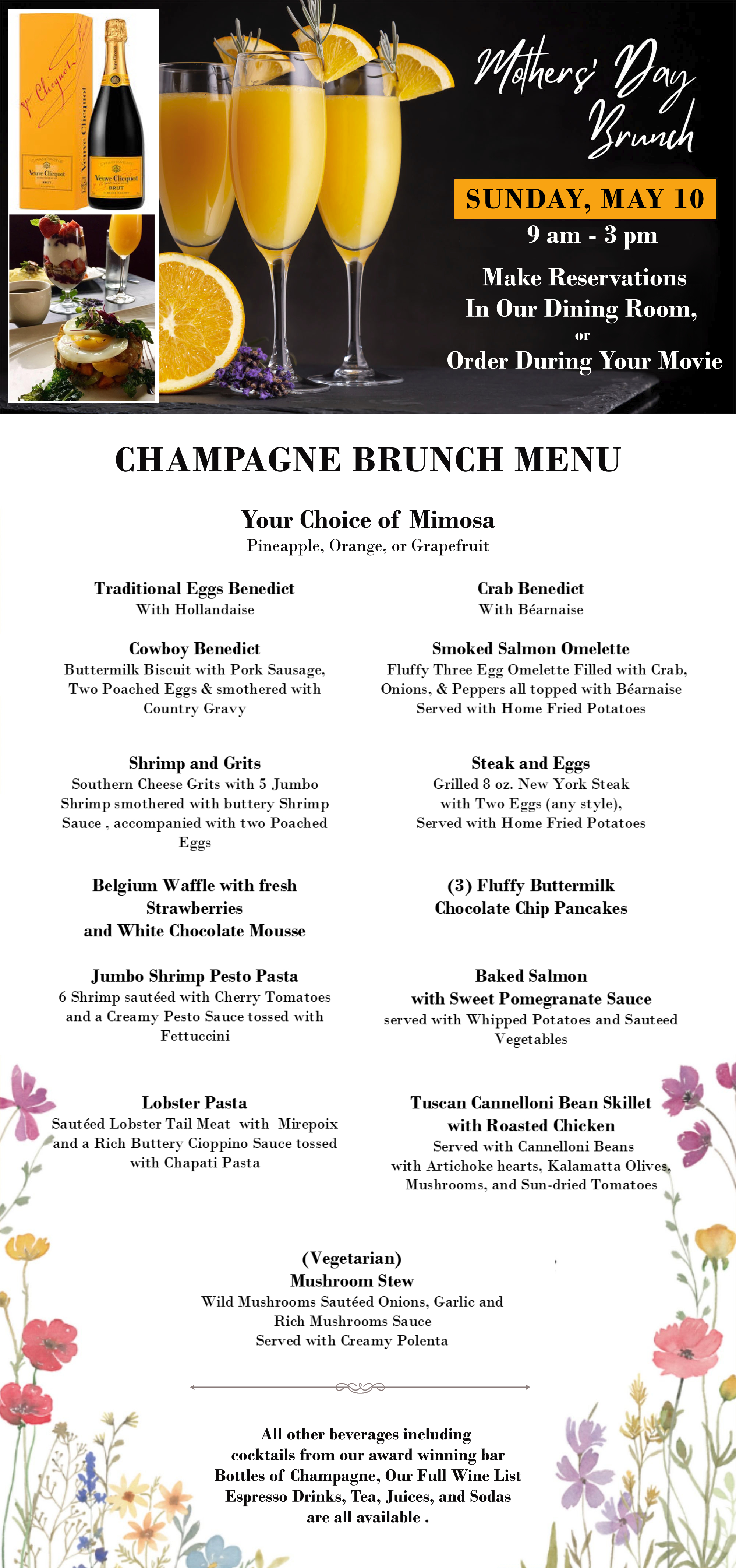 to purchase a movie ticket for your desired movie. Please remember to show up 30 mins early for your movie! You will be able to order from the Mother's Day Champagne Brunch menu as you normally would from our normal menu and your meals will be brought to your seat.