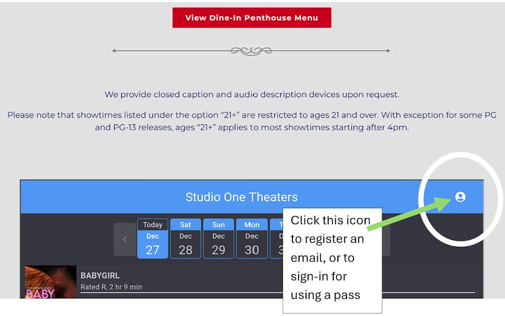 ii- Scroll down to the movie times window. At the top right of the movie times, click the "Person" icon.