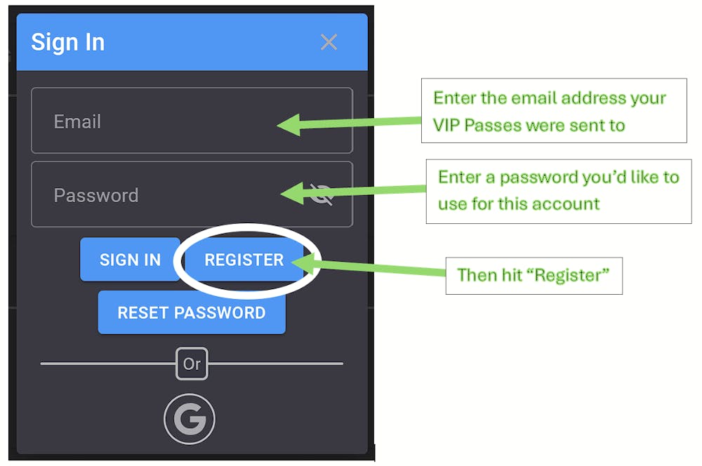 iii- When the Sign In window pops up, enter the email address to which your passes were emailed, and also enter a password you will remember. Then click "Register".