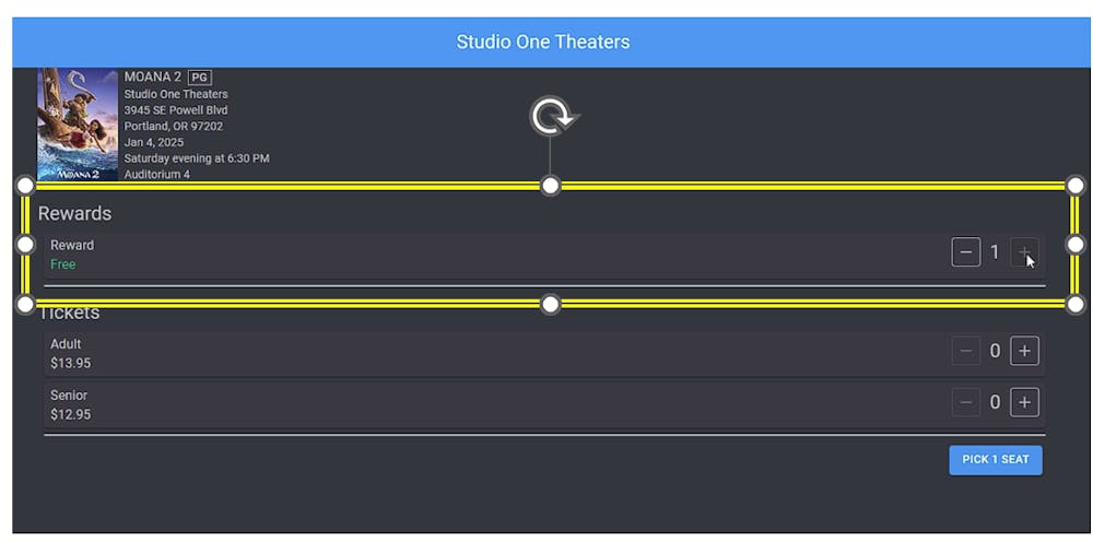 v- Now pick your movie normally. When you go to pick the number of seats, you can choose to use one or both of your movie passes from "REWARDS" and the cost will be subtracted from your final total. Again note the convenience fee will still be applied. Check out as with your payment method as you normally would.